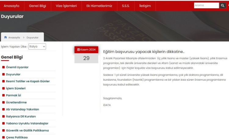 Türkiye’de İtalya vizesi için yetkili tek kurum olan iData, ülkede üniversite okumak isteyen öğrencilerin vize başvurusunu almayı durdurduğunu açıkladı.