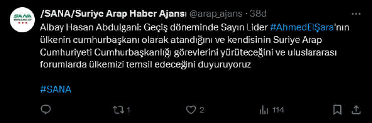 Abdulgani, açıklamasında, "Geçiş döneminde Lider Ahmed El Şara'nın ülkenin Cumhurbaşkanı olarak atandığını ve kendisinin Suriye Arap Cumhuriyeti Cumhurbaşkanlığı görevlerini yürüteceğini ve uluslararası forumlarda ülkemizi temsil edeceğini duyuruyoruz" dedi. Abdulgani, Cumhurbaşkanı'na, ülke için kalıcı bir anayasa onaylanıp yürürlüğe girinceye kadar görev yapacak geçiş dönemi için geçici yasama konseyini kurma yetkisi verildiğini kaydetti.