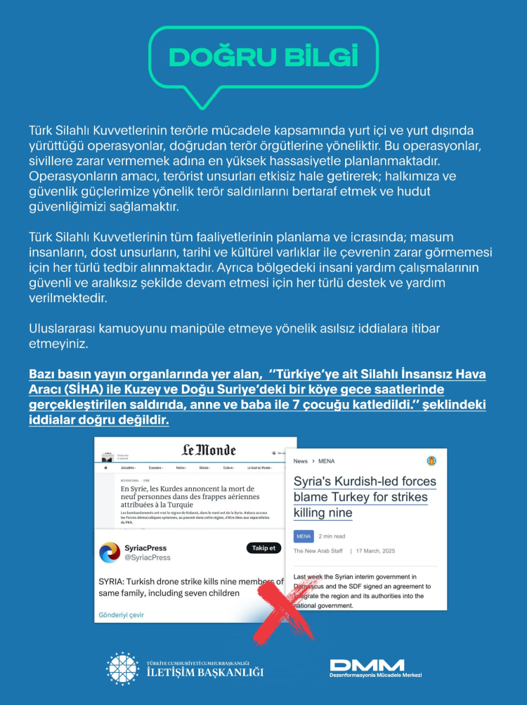 Bazı basın yayın organlarında yer alan, "Türkiye’ye ait Silahlı İnsansız Hava Aracı (SİHA) ile Kuzey ve Doğu Suriye’deki bir köye gece saatlerinde gerçekleştirilen saldırıda, anne ve baba ile 7 çocuğu katledildi.’’ şeklindeki iddiaların gerçeği yansıtmadığı açıklandı.