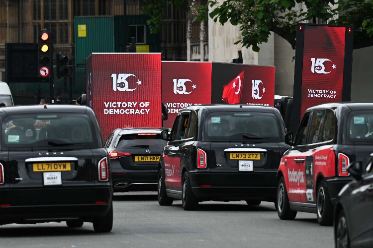 Londra'da Bakanlıklar, devlet kurumları, parlamento ile tarihî ve turistik yapıların bulunduğu bölgelerde dolaşan LED ekranlı araçlar, FETÖ'nün 15 Temmuz darbe girişimini ve Türk halkının buna karşı mücadelesini anlattı.