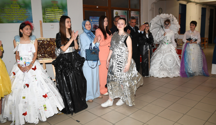 Osmangazi Belediyesi İklim Değişikliği ve Sıfır Atık Müdürlüğü tarafından düzenlenen seminer sonunda öğrenciler, kullanılmış karton tabak ve bardak, giyilmiş gelinlik, atık perde, çöp poşetleri, ders notu kağıtları gibi geri dönüşüm malzemelerinden yapmış oldukları kıyafetler ve el işi ürünler ile geri dönüşümün önemine dikkat çekti.
