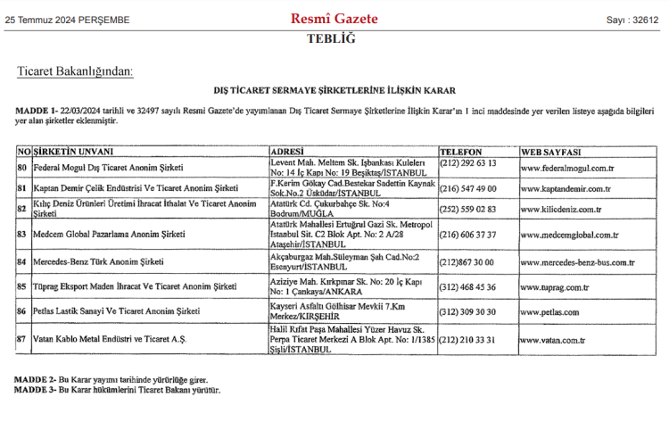 Ticaret Bakanlığı, bugünkü Resmi Gazete'de yayımlanan kararla 8 şirketi "Dış Ticaret Sermaye Şirketi" statüsüne dahil etti.