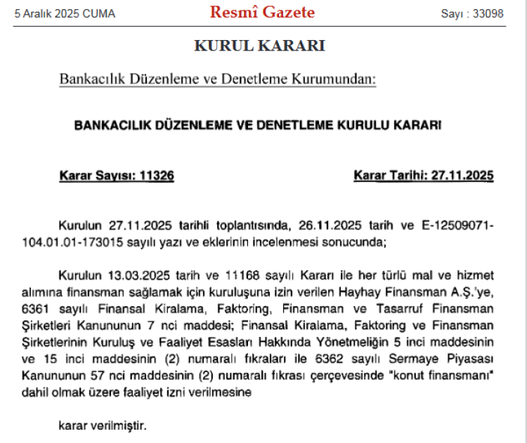 Bankacılık Düzenleme ve Denetleme Kurulu (BDDK), 27 Kasım 2025 tarihli 11326 sayılı kararıyla Hayhay Finansman A.Ş.'ye faaliyet izni verdi. Resmi Gazete'de yayımlanan karar, şirketin konut finansmanı dahil her türlü mal ve hizmet alımı için kredi sağlayabilmesini resmileştirdi. Finans sektörüne yeni bir oyuncu eklendi.