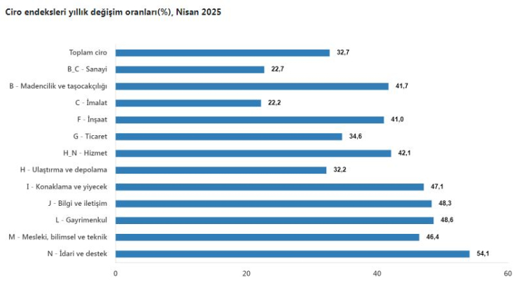 2025 Nisan verilerine göre, yıllık bazda hizmet sektörü ciro endeksi yüzde 42,1’lik artışla liderliği göğüslerken, inşaat sektörü yüzde 41,0’luk yükselişle ikinci sırada yer aldı. Ticaret sektörü yüzde 34,6, sanayi sektörü ise yüzde 22,7 büyüme gösterdi.