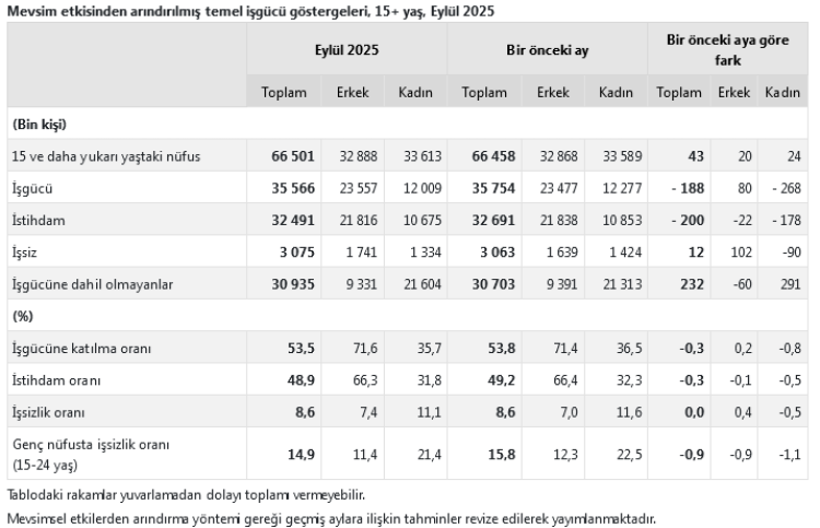 TÜİK’in Hanehalkı İşgücü Araştırması sonuçlarına göre, Eylül 2025’te Türkiye’de mevsim etkisinden arındırılmış işsizlik oranı yüzde 8,6 seviyesinde sabit kaldı. Genç nüfusta işsizlik ise bir önceki aya göre düşüş göstererek yüzde 14,9 oldu.