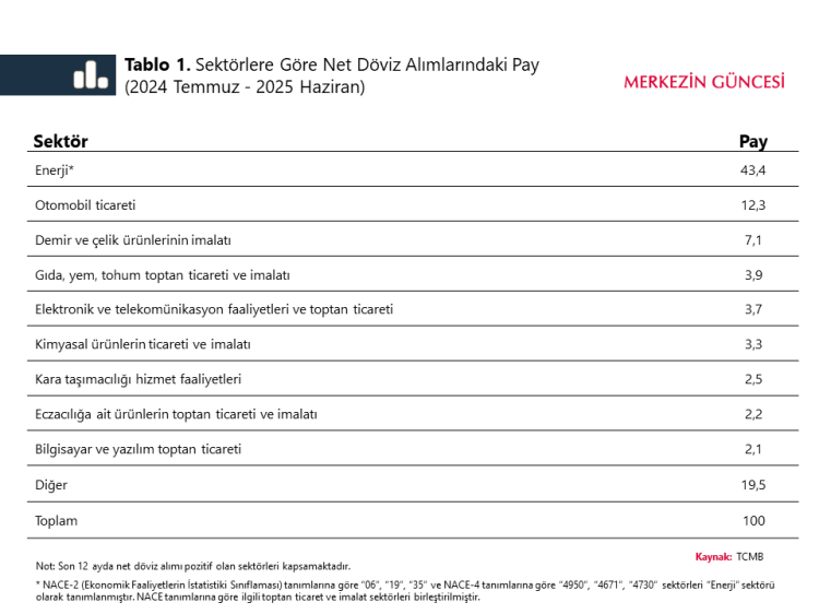 Analizde son 12 ayda döviz alımı fazla olan sektörlerin enerji, otomobil ticareti, demir-çelik, kimya ve telekomünikasyon gibi ithalatçı sektörler olduğu belritildi.