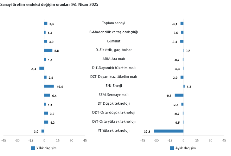 Aylık bazda ise sanayi üretimi Nisan 2025’te yüzde 3,1 geriledi. Alt sektörlerde madencilik ve taş ocakçılığı endeksi yüzde 2,5, imalat sanayi endeksi yüzde 3,4 düşüş gösterirken, elektrik, gaz, buhar ve iklimlendirme sektörü endeksi yüzde 0,2’lik hafif bir artışla pozitif ayrıştı.