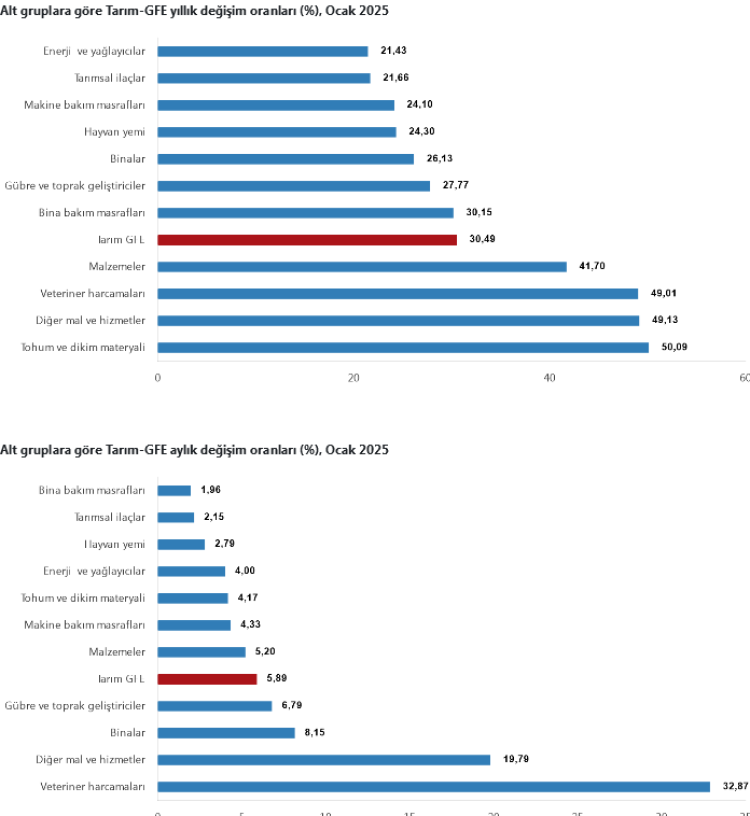 TÜİK'in son istatistiki verilerine göre Tarımsal Girdi Fiyat Endeksi yıllık yüzde 30,49, aylık ise yüzde 5,89 oranında artış gösterdi. En yüksek artış yıllıkta yüzde 50,09 artış ile tohum ve dikim materyali, aylık bazda ise yüzde 32,87 ile veteriner harcamalarında yaşandı.