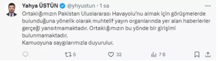 BURSA (İGFA) - Pakistan Maliye Devlet Bakanı Ali Pervaiz Malik'in, THY ile PIA'nın satışı konusunda müzakerelerin sürdüğünü belirtmesinin ardından, medya organlarında bu konuya dair birçok haber yayınlandı. Bakan, ayrıca Pakistan'ın Uluslararası Para Fonu (IMF) programını tamamlamasına yakın olduğunu ve bu durumun ülkeye yeni finansal fırsatlar sunacağını ifade etti. Ancak Türk Hava Yolları Basın Müşaviri Yahya Üstün sosyal medya üzerinden yaptığı açıklamada, “Ortaklığımızın Pakistan Uluslararası Havayolu’nu almak için görüşmelerde bulunduğuna yönelik olarak muhtelif yayın organlarında yer alan haberler gerçeği yansıtmamaktadır. Ortaklığımızın bu yönde bir girişimi bulunmamaktadır.” dedi.