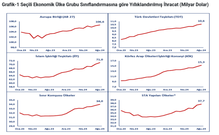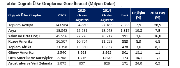 Coğrafi ülke gruplarında, 2024 yılı Ocak-Ağustos döneminde, bir önceki yılın aynı dönemine göre; Avrupa ülkelerine yapılan ihracatımız yüzde 2,5 artışla (2,3 milyar dolar artış) 97,2 milyar dolara, Asya ülkelerine yapılan ihracatımız yüzde 10,8 artışla (1,3 milyar dolar artış) 13,5 milyar dolara, Yakın ve Ortadoğu ülkelerine yapılan ihracatımız yüzde 3,6 artışla (991 milyon dolar artış) 27,7 milyar dolara, Kuzey Amerika ülkelerine yapılan ihracatımız yüzde 8,3 artışla (888 milyon dolar artış) 11,7 milyar dolara, Güney Amerika ülkelerine yapılan ihracatımız yüzde 18,1 artışla (301 milyon dolar artış) 2,0 milyar dolara ulaştı.