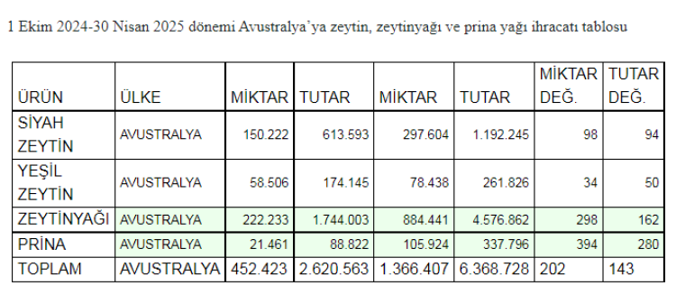 Türkiye genelinde ise Avustralya’ya zeytinyağı ihracatı yüzde 162 artışla 1,7 milyon dolardan 4,6 milyon dolara, sofralık zeytin ihracatı yüzde 85 artışla 787 bin dolardan 1,45 milyon dolara ulaştı. Siyah zeytin ihracatı yüzde 94 artarak 1,19 milyon dolara, yeşil zeytin ihracatı yüzde 50 artarak 261 bin dolara, prina yağı ihracatı ise yüzde 280 artışla 338 bin dolara yükseldi.