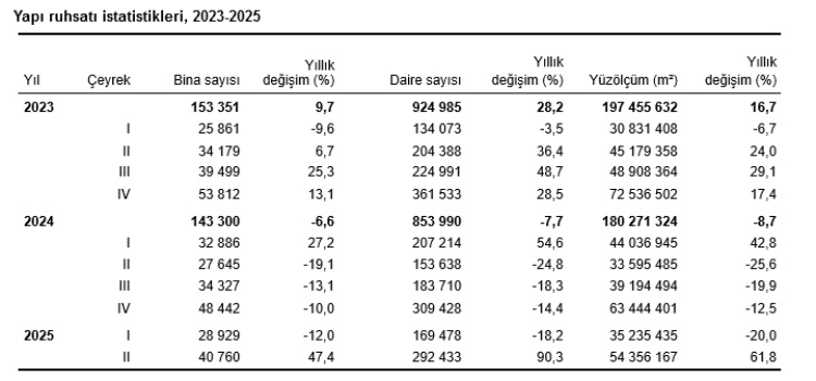 TÜİK'in 2025 yılı ikinci çeyrek Yapı İzin İstatistikleri’ne göre, yapı ruhsatı verilen bina sayısı yüzde 47,4, daire sayısı yüzde 90,3, yüzölçüm yüzde 61,8 artarken, yapı kullanma izin belgelerinde de yüzde 30,2’lik artış kaydedildi.