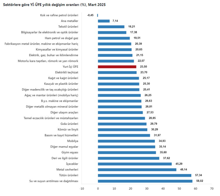 TÜİK verilerine göre Mart ayına ilişkin Yurt İçi Üretici Fiyat Endeksi (Yİ-ÜFE) yıllık yüzde 23,50, aylık ise yüzde 1,88 oranında arttı. Yıllık değişimde su ve suyun arıtılması ve dağıtılması en yüksek artış kaydeden sanayi sektörü olarak öne çıktı.