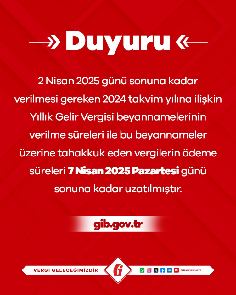 2024 yılına ilişkin normalde 31 Mart olan ancak bayram dolayısıyla bu yıl 2 Nisan 2025 tarihine kadar verilmesi gereken Yıllık Gelir Vergisi Beyannameleri'nin verilme ve ödeme sürelerini uzattı.