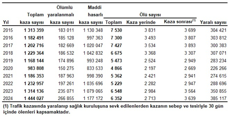 Türkiye’de 2024 yılında 1,4 milyon trafik kazası meydana geldi. 266 bin 855 ölümlü yaralanmalı kazada 6 bin 352 kişi hayatını kaybetti, 385 bin 117 kişi yaralandı. Ölümler yüzde 3 azalırken, yaralı sayısı yüzde 9,8 arttı.