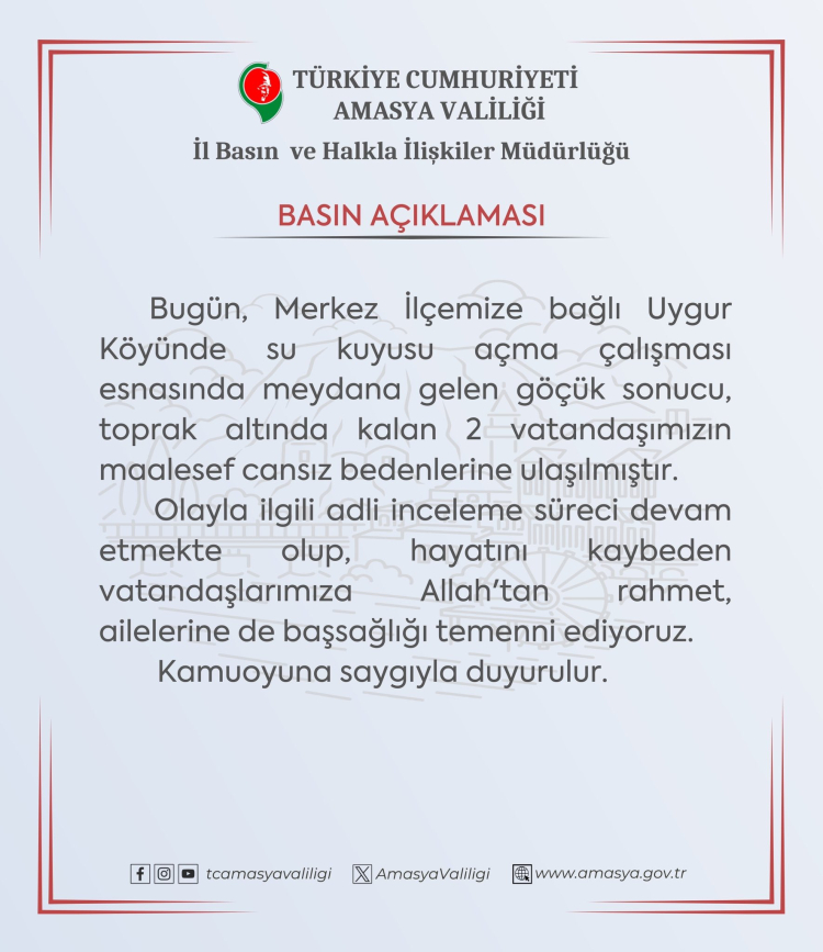 AMASYA (İGFA) - Amasya'nın merkez ilçesine bağlı Uygur Köyü'nde özel bir arazide su kuyusu açma çalışmaları sırasında göçük meydana geldi. Göçükte 2 kişi hayatını kaybetti.