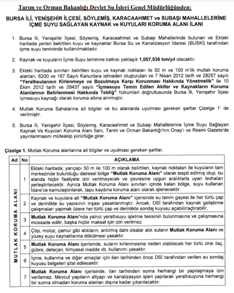 Resmi Gazete'de yayımlanan karara göre; Bursa'nın Yenişehir ilçesine bağlı Söylemiş, Karacaahmet ve Subaşı mahallelerine içme suyu sağlayan kaynak ve kuyular, 'Yer Altı Sularının Kirlenmeye ve Bozulmaya Karşı Korunması Hakkında Yönetmelik ile İçme Suyu Temin Edilen Akifer ve Kaynakların Koruma Alanlarının Belirlenmesi Hakkında Tebliğ' hükümleri doğrultusunda koruma altına alındı.