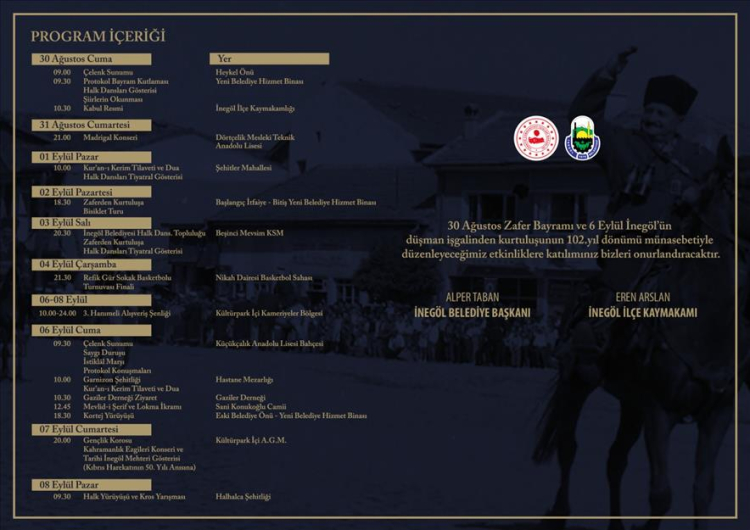 Belediye Başkanı Alper Taban, açıklamasında 30 Ağustos Zafer Bayramı ve akabinde başlayacak olan 6 Eylül İnegöl’ün düşman işgalinden kurtuluşunun 102. Yılı etkinliklerine tüm ilçe halkını davet etti. Taban, “Zaferin ve kurtuluşun coşkusunu tüm ilçe halkımızla birlikte yaşamak istiyoruz. Bizler bu 10 günlük süreçte şehrimizde dolu dolu yaşanacak etkinlikler planladık. Vatandaşlarımızı da bu etkinliklerde görmeyi arzu ediyoruz. Etkinliklerimiz 30 Ağustos Cuma sabahı 09.00’da Zafer Bayramı kutlamaları kapsamında Atatürk Anıtına çelenk sunumuyla başlayacak. Akabinde aynı gün 09.30’da Yeni Belediye Binası önünde halk dansları gösterileri, şiirler okunacak. 10.30’da Kaymakamlık makamında resmi kabul töreni gerçekleştirilecek. 31 Ağustos Cumartesi akşamı ise Dörtçelik EML bahçesinde “Zaferden Kurtuluşa Madrigal Konseri” olacak. 01 Eylül Pazar günü zaferin ardından kurtuluş etkinliklerimiz devam edecek. Pazar günü 10.00’da Şehitler köyü Kurtuluş Savaşı Şehitliği’nde Kuranı Kerim tilaveti ve dualar yapılacak. 02 Eylül Pazartesi 18.30’da itfaiye kavşağından yeni belediye binası önüne kadar Zaferden Kurtuluşa Bisiklet Turu yapılacak. 03 Eylül Salı akşamı 20.30’da Beşinci Mevsim Kültür Merkezimizde İnegöl Belediyesi Halk Dansları Topluluğu “Zaferden Kurtuluşa Halk Dansları Tiyatral Gösterisi” yapılacak. 04 Eylül Çarşamba akşam 21.30’da nikah salonu önündeki basketbol sahasında Refik Gür Sokak Basketbolu Turnuvasının finali yapılacak. 06 Eylül Cuma İnegöl’ün Kurtuluşunun 102. Yıl Dönümü Resmi Törenleri yapılacak. Sabah 09.30’da Küçükçalık Anadolu Lisesi Bahçesinde çelenk töreni, 10.00’da Garnizon Şehitliği ziyareti, 10.30’da Gaziler Derneği ziyareti ve 12.45’te Sani Konukoğlu Camisinde mevlit ile Cuma namazı sonrası lokma ikramları olacak. 18.30’da Sani Konukoğlu Camisinden yeni belediye binası önüne kadar kortej yürüyüşü gerçekleştirilecek ve burada halk dansları gösterileri yapılacak. Yine 06 Eylül Cuma sabah 10.00 itibariyle Kültürpark kameriyeler bölgesinde 3. Hanımeli Alışveriş Şenliğimiz başlayacak. 8 Eylül Pazar akşam 00.00’a kadar açık olacak. 6 Eylül Cuma akşamı 20.00’da yerel ekiplerimizden Oktay Esen’in pop konseri alışveriş şenliği alanında gerçekleştirilecek. 07 Eylül Cumartesi; 20.00’da Amfi Tiyatroda Kıbrıs Harekatının 50. yılı anısına özel bir gece olacak. Gençlik korosu “Kahramanlık Ezgileri” konseri ve Tarihi İnegöl Mehterimizin Gösterisi yer alacak. 08 Eylül Pazar günü de finalde 09.30’da Halhalca Şehitliğinde Kros Yarışması ve Halk Yürüyüşümüz olacak. Bu yıl 3’üncüsü yapılan geleneksel etkinliğimizde, İnegöl’de Kurtuluş Savaşının en çetin mücadelesinin verildiği bölgede o günlerin anısına yürüyeceğiz. Kros ve yürüyüş bitiminde tüm katılımcılara simit ve çay ikramlarımız olacak” diye konuştu.