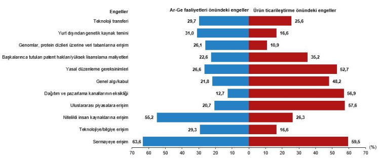 İstatistiki verilerde biyoteknoloji faaliyeti yürüten 687 girişime göre; biyoteknolojik Ar-Ge faaliyetlerinin önündeki en önemli engel yüzde 63,6 ile "sermayeye erişim" iken bunu yüzde 55,2 ile "nitelikli insan kaynaklarına erişim" ve yüzde 31,0 ile "yurt dışından genetik kaynak temini" izledi. Biyoteknoloji ürünlerinin ticarileşmesinin önündeki en büyük engel olarak yüzde 59,5 ile "sermayeye erişim"i olurken, bunu yüzde 57,6 ile "uluslararası piyasalara erişim" ve yüzde 56,9 ile "dağıtım ve pazarlama kanallarının eksikliği" izledi.