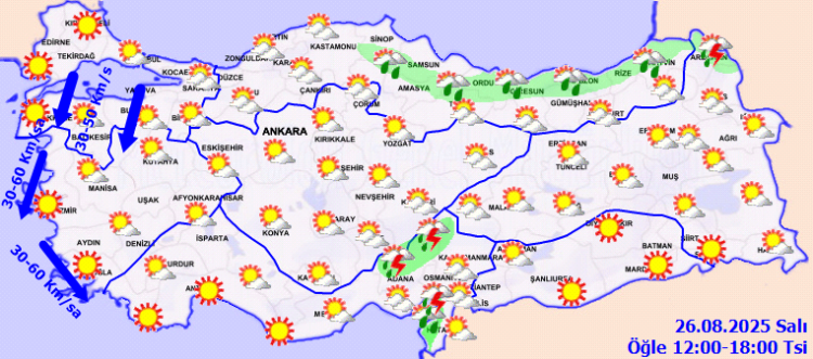 ANKARA (İGFA) - Meteoroloji Genel Müdürlüğü, 26 Ağustos 2025 tarihli hava durumu raporunu yayımladı. Buna göre, Türkiye'nin kuzey kesimleri ile Doğu Akdeniz'de parçalı ve yer yer çok bulutlu bir hava bekleniyor.