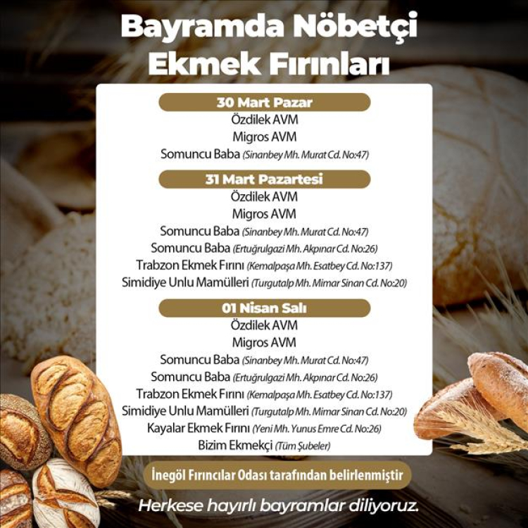 İnegöl Belediyesi’nden konuya ilişkin yapılan açıklamada şu ifadelere yer verildi: “Fırıncılar Odası ile yaptığımız istişareler neticesinde bayram süresince fırınların kapalı olması kararlaştırılmıştır. Ancak vatandaşlarımızın mağduriyet yaşamaması adına ekmek ihtiyacını karşılayabilmek için 3 gün boyunca nöbetçi fırın uygulamasına gidilecektir. Nöbetçi olarak hizmet verecek fırınlar ise Fırıncılar ve Benzerleri Odası tarafından belirlenmiştir.”