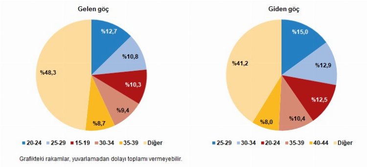 Türkiye'den göç eden nüfusun yaş gruplarına bakıldığında, en fazla göç edenlerin yüzde 15 ile 25-29 yaş grubunda olduğu görüldü. Bu yaş grubunu yüzde 12,9 ile 30-34 ve yüzde 12,5 ile 20-24 yaş grubu izledi.