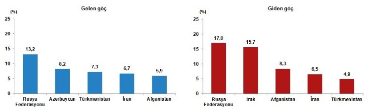 Türkiye'ye 2023 yılında gelen yabancı uyruklu nüfus içinde ilk sırayı yüzde 13,2 ile Rusya Federasyonu vatandaşları aldı. Rusya Federasyonu'nu yüzde 8,2 ile Azerbaycan, yüzde 7,3 ile Türkmenistan, yüzde 6,7 ile İran ve yüzde 5,9 ile Afganistan vatandaşları izledi. Türkiye'den göç eden yabancı uyruklu nüfus içinde ilk sırayı yüzde 17 ile Rusya Federasyonu vatandaşları aldı. Rusya Federasyonu'nu, yüzde 15,7 ile Irak, yüzde 8,3 ile Afganistan, yüzde 6,5 ile İran ve yüzde 4,9 ile Türkmenistan vatandaşları takip etti.