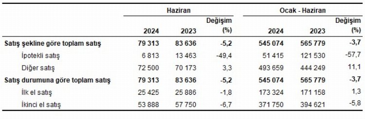 Haziran'da ipotekli satışların, bin 547'si; Ocak-Haziran dönemindeki ipotekli satışların ise 12 bin 176'sı ilk el satış olarak gerçekleşti. Diğer satış türleri sonucunda 72 bin 500 konut el değiştirdi