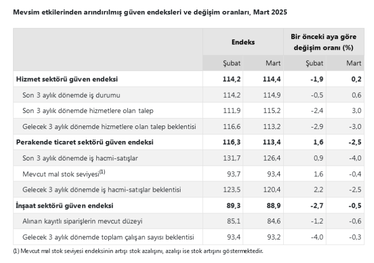 Mevsim etkilerinden arındırılmış güven endeksi Mart ayında bir önceki aya göre; hizmet sektöründe yüzde 0,2 oranında artarak 114,4 değerini, perakende ticaret sektöründe yüzde 2,5 oranında azalarak 113,4 değerini ve inşaat sektöründe yüzde 0,5 oranında azalarak 88,9 değerini aldı.