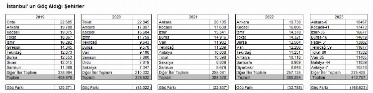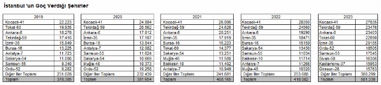 TÜİK’ten alınan, 2019- 2023 yılları arasında gerçekleşen konut satış verilerine göre dei İstanbul’dan göç edilen şehirlerin başında gelen Kocaeli, Ankara, İzmir, Bursa, Antalya konut satış sıralamasında son dört yıldır ilk 10'da yer almaktadır. 2020, 2021 ve 2022 yıllarında listede bulunan Tekirdağ 2023 yılında yer almazken, Balıkesir son 3 yıldır listeye girmiş durumda.