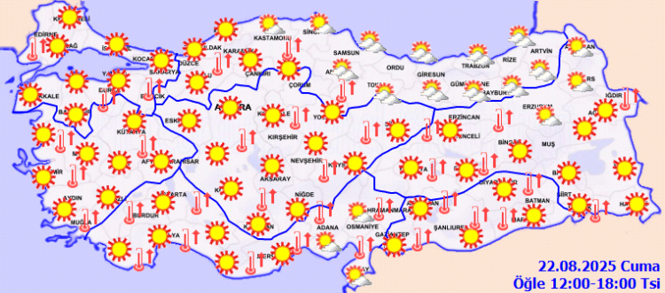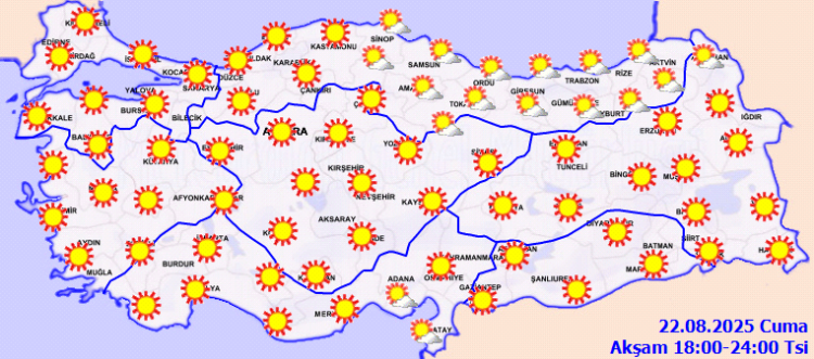 Meteoroloji Genel Müdürlüğü’nün 22 Ağustos tarihli değerlendirmelerine göre, Türkiye genelinde yaz havası etkisini sürdürüyor.