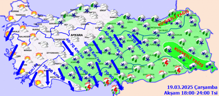 Genellikle karla karışık yağmur ve kar, Akdeniz kıyıları ile Güneydoğu Anadolu’da yağmur ve sağanak şeklinde görülmesi beklenen yağışların, Doğu Akdeniz, İç Anadolu’nun doğusu, Doğu Karadeniz, Doğu Anadolu'nun kuzeybatısı, Ordu, Şırnak, Hakkâri ve Siirt çevreleri ile Diyarbakır ve Batman'ın doğusunda yer yer kuvvetli olacağı tahmin ediliyor.