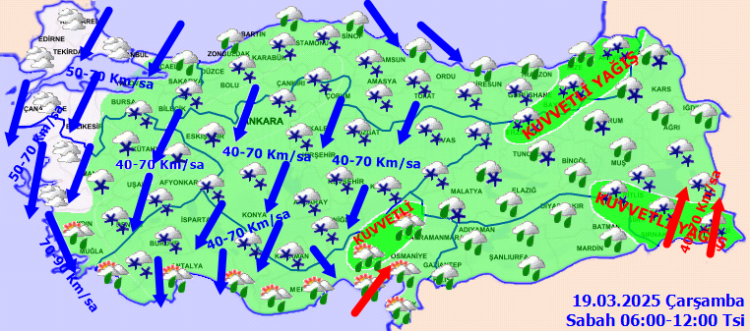 Rüzgarın, Marmara, Ege ve Orta Karadeniz ile İç Anadolu'nun güney ve batısı ile Doğu Anadolu'nun güneydoğusunda kuvvetli (40-70 km/sa), Akdeniz'de yer yer kısa süreli fırtına (70-90 km/sa) şeklinde esmesi beklendiğinden meydana gelebilecek olumsuzluklara karşı dikkatli ve tedbirli olunması gerekmektedir.