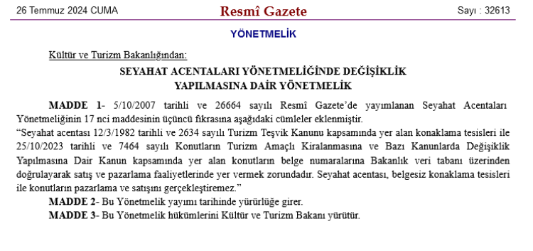 Söz konusu bu düzenlemeye göre seyahat acenteları, ilgili kanun kapsamında bulunan konutların belge numaralarına Bakanlık veri tabanı üzerinden doğrulayıp satış ve pazarlama faaliyetlerinde yer vermek zorunda olacak. Bu acenteler, belgesiz konaklama tesisleri ile konutların pazarlama ve satışını yapamayacak.