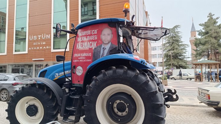 Pazaryeri Gündem / BİLECİK İGFA - Pazaryeri ilçesinde çiftçilik ile uğraşan ve ilçede Tarımsal Kalkınma Kooperatifi ve Sulama birliği başkanı Erkan Karakaş, 31 Mart Yerel Seçimlerinde Pazaryeri ilçesinden Bağımsız İl Genel Meclis Üyesi adayı olurken, Karakaş daha önceden gelin arabası yaptığı traktörünü bu sefer de seçim afişleri ile donatıp seçim ilçe sokaklarında vatandaşlardan kendine destek istedi.