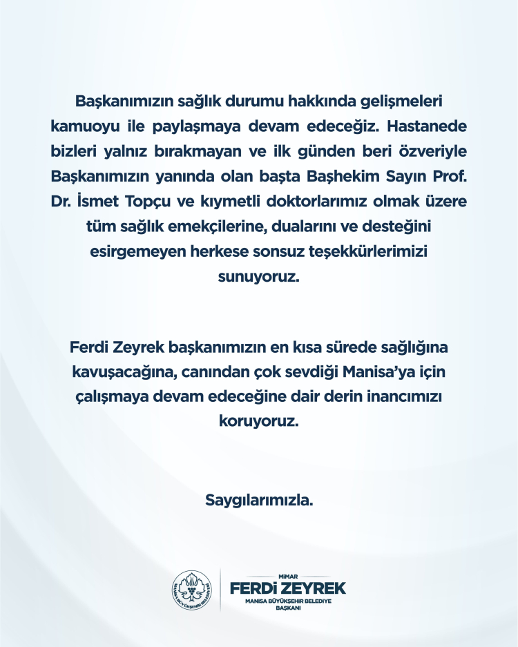 Manisa Büyükşehir Belediyesi'nce yapılan açıklamada, "Hastanede kendilerini yalnız bırakmayan ve ilk günden beri özveriyle Başkanımızın yanında olan başta Başhekim Sayın Prof. Dr. İsmet Topçu ve kıymetli doktorlarımız olmak üzere tüm sağlık emekçilerine, dualarını ve desteğini esirgemeyen herkese sonsuz teşekkürlerimizi sunuyoruz. Ferdi Zeyrek başkanımızın en kısa sürede sağlığına kavuşacağına, canından çok sevdiği Manisa için çalışmaya devam edeceğine dair derin inancımızı koruyoruz" ifadeleri yer aldı.
