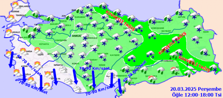 Rüzgarın, Güney Ege, İç Anadolu'nun güneyinde kuvvetli (40-70 km/sa), Akdeniz'de yer yer kısa süreli fırtına (70-90 km/sa) şeklinde esmesi beklendiğinden meydana gelebilecek olumsuzluklara karşı dikkatli ve tedbirli olunması gerekmektedir.