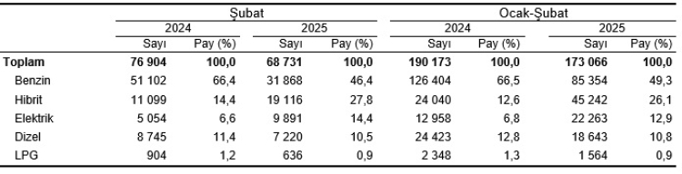 Şubat ayında geçen yılın aynı ayına göre trafiğe kaydı yapılan taşıt sayısı otobüste yüzde 41,1, minibüste yüzde 29,2 artarken motosiklette yüzde 47,2, traktörde yüzde 38,1, kamyonette yüzde 31,1, özel amaçlı taşıtta yüzde 26,0, kamyonda yüzde 23,4 ve otomobilde yüzde 10,6 azaldı.