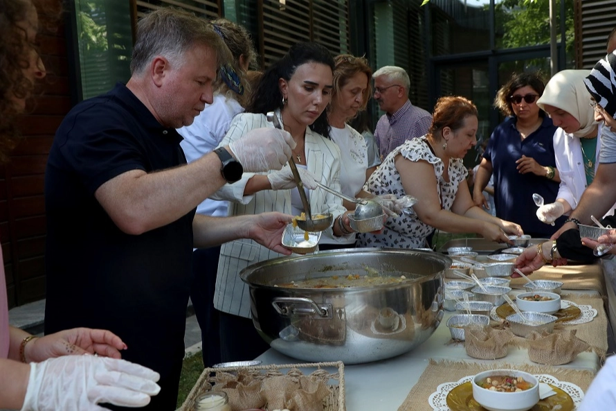 Ailelerin de katıldığı ikram programında herkes kazanların başında bir araya geldi, birbirine kepçelerle aşure ikram etti.