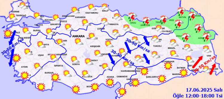 Rüzgârın, Kuzey Ege kıyıları, İç Anadolu’nun doğusu ve Doğu Anadolu’nun batısında kuzeyli yönlerden, Doğu Anadolu’nun güneydoğusunda güneyli yönlerden kuvvetli (30-50 km/saat) esmesi beklendiğinden yaşanabilecek olumsuzluklara karşı dikkatli ve tedbirli olunması gerekmektedir.