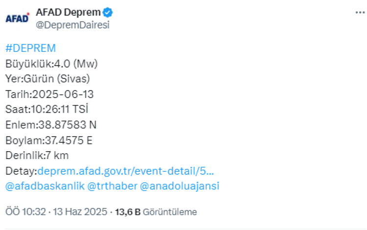 Sivas'ın Gürün ilçesinde saat 10.26'da 4 büyüklüğünde deprem meydana geldi.