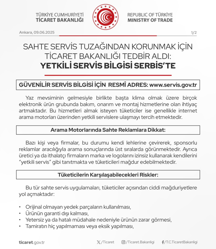 Sahte servislerle mücadele kapsamında denetimlerini sürdüreceğini ve gerekli idari yaptırımların uygulanacağını vurgulayan Bakanlık, vatandaşlara yetkili servis hizmeti almadan önce ürünün üretici veya ithalatçı firma bilgilerini kontrol etmeleri ve www.servis.gov.tr adresini kullanmaları çağrısında bulundu.