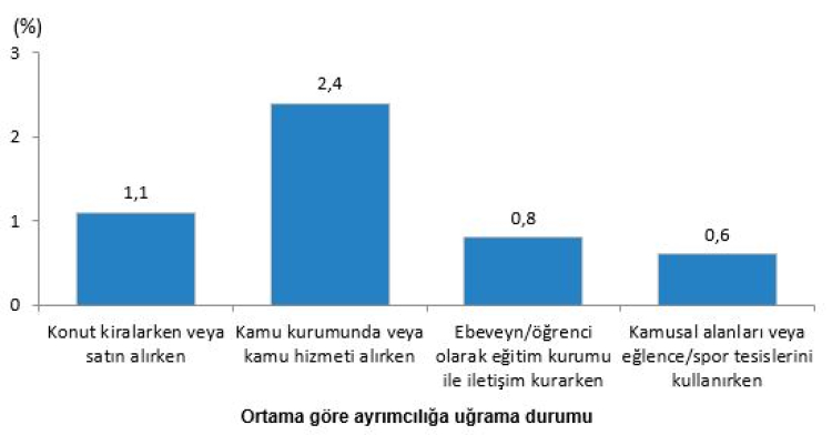 Aynı dönemde ebeveyn/veli veya öğrenci olarak bir eğitim kurumundan biri ile iletişim kurarken ayrımcılığa uğrayanların oranı yüzde 0,8, kamusal alanlarda (alışveriş merkezi, kafe, restoran vb.) veya eğlence/spor tesislerini kullanırken ayrımcılığa uğradığını hissedenlerin oranı ise yüzde 0,6 oldu.