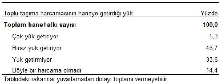 Son 12 ay içerisinde toplu taşıma harcamalarının haneye getirdiği yük incelendiğinde; hanehalklarının yüzde 5,3'üne toplu taşıma harcamasının çok yük getirdiği, yüzde 46,7'sine ise biraz yük getirirken, yüzde 33,6'sına ise yük getirmediği görüldü.