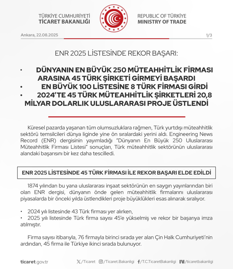 Türk müteahhitlik sektörü, ENR 2025 “Dünyanın En Büyük 250 Uluslararası Müteahhitlik Firması” listesinde 45 firmayla rekor kırarak Çin’in ardından ikinci oldu. İlk 100’de 8, ilk 50’de 2 Türk firması yer alırken, teknik müşavirlikte de 8 firma listeye girdi.