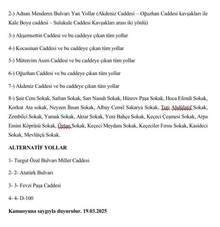 Valilik trafiğe kapatılacak alanları ve noktaları yazılı açıklamasında tek tek duyurdu.. İşte o açıklama