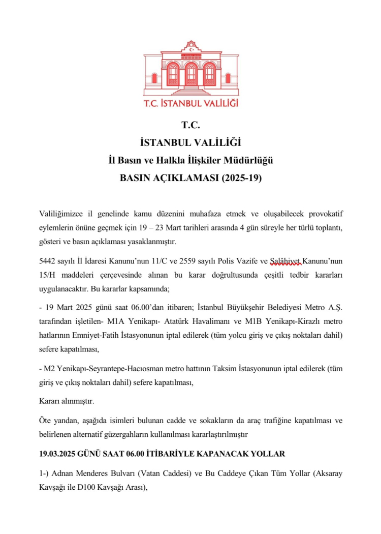 İstanbul Valiliği, kent genelinde kamu düzenini muhafaza etmek ve oluşabilecek provokatif eylemlerin önüne geçmek için 19 - 23 Mart tarihleri arasında 4 gün süreyle her türlü toplantı, gösteri ve basın açıklamasının yasaklandığını duyurdu.