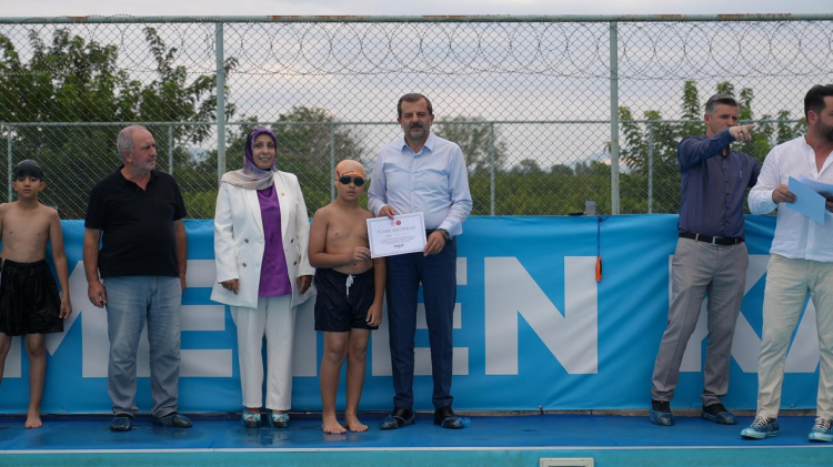 Bursa'da Gürsu Belediyesi'nin her yıl yaz döneminde açtığı havuz sezonunda eğitim gören minik yüzücüleri, bu yıl da sertifika dağıtarak mezun etti.