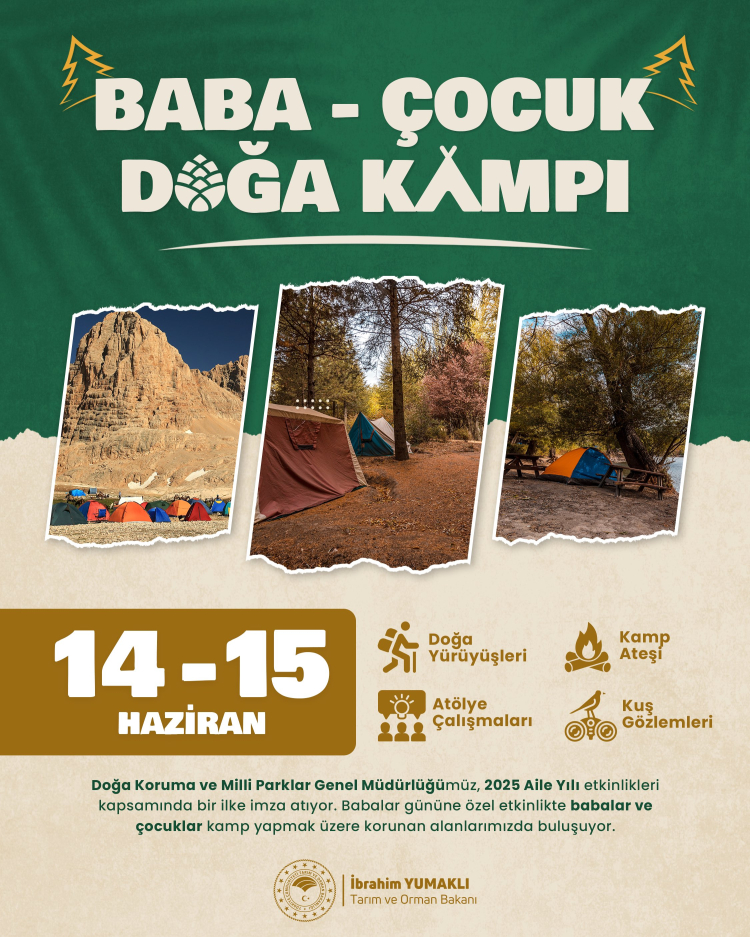 ANKARA (İGFA) - Tarım ve Orman Bakanı İbrahim Yumaklı, Doğa Koruma ve Milli Parklar Genel Müdürlüğü’nün 2025 Aile Yılı çerçevesinde düzenlediği Baba-Çocuk Doğa Kampı etkinliğini duyurdu.