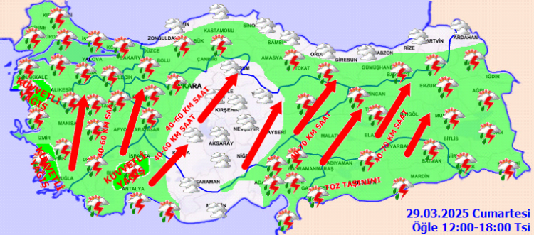 KUVVETLİ RÜZGÂR UYARISI: Rüzgârın; Ege, Akdeniz’in iç kesimleri, İç Anadolu’nun güney ve doğusu, Orta ve Doğu Karadeniz’in iç kesimleri ile Doğu ve Güneydoğu Anadolu’nun batısında güneyli yönlerden kuvvetlİ, İç Anadolu’nun doğusunda kısa süreli fırtına şeklinde (40-70 km/saat) esmesi beklendiğinden yaşanabilecek olumsuzluklara karşı dikkatli ve tedbirli olunması gerekmektedir.
